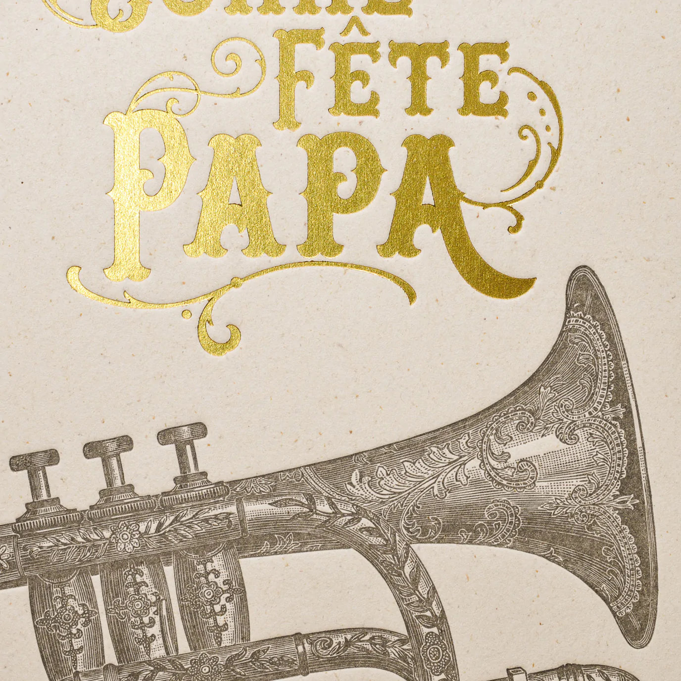 Gyönyörű klasszikus üdvözlőkártya vintage hangulatú trombita lenyomatával, aranyozottan csillogó „Bonne Fête Papa” („Boldog Apák napját!”) felirattal.