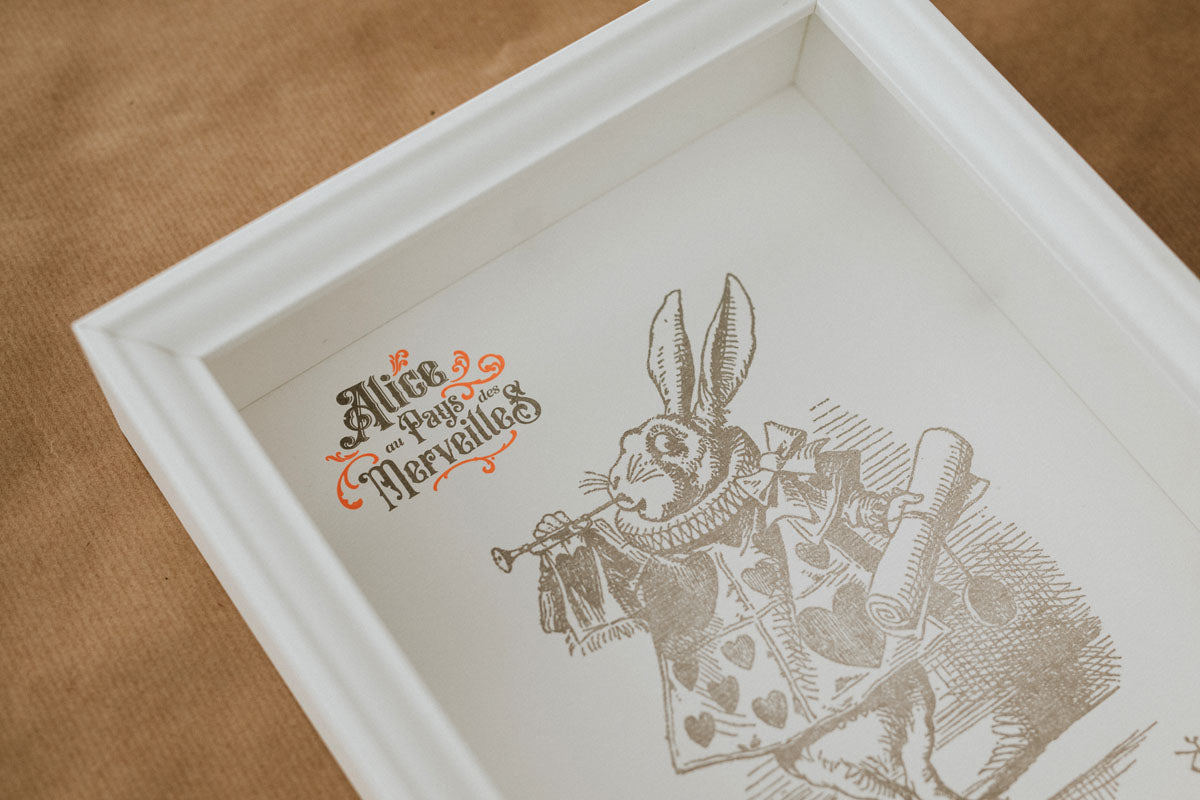 Kétszínű, mélynyomott papírkülönlegesség az "Alice csodaországban" sorozatból. A fehér Nyuszit ábrázoló, részletgazdag illusztráció a könyv eredeti kiadásából való, a hozzá tartozó (idegennyelvű) idézet narancsszínnel van kiemelve.