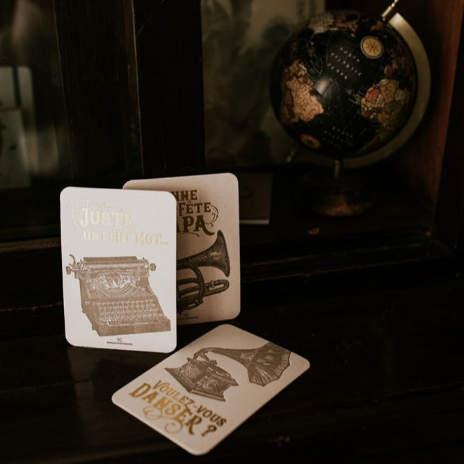 Kitűnő ajándéktárgy vagy gyűjtői darab. A kártyát hagyományos módon, kézi nyomással, egy régi Heidelberg nyomdagépen készítik a Letterpress franciaországi műhelyében, kiváló minőségű vastag papír felhasználásával.